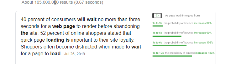 Base on google, 40 percent of consumers will wait no longer than 3 seconds for the website to render before leaving the page. shoppers will often feel more distracted when made to wait a page to load.